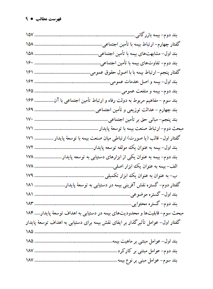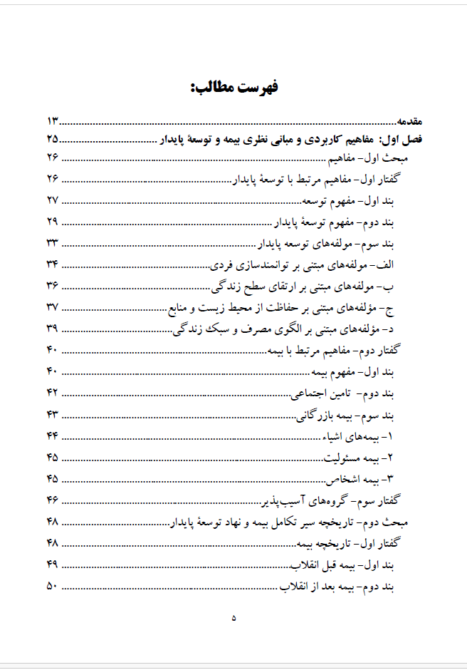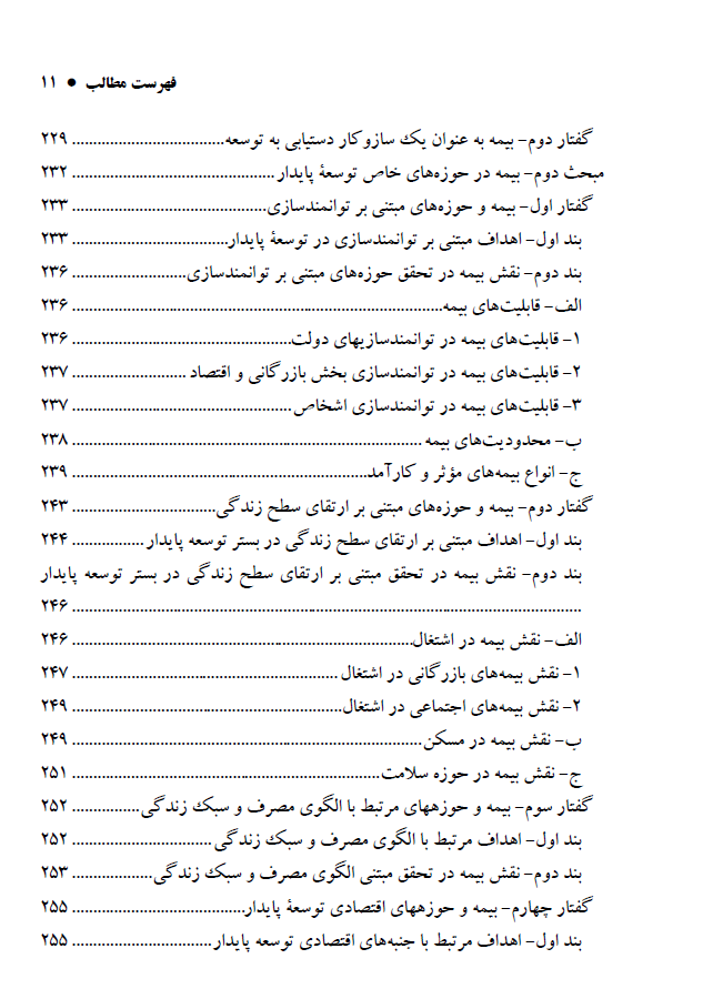 کتاب ساختار حقوقی و نهادی صنعت بیمه را واکاوی کرده و جایگاه دولت را در هدایت، نظارت و تنظیمگری از طریق نهادهایی چون سازمان تأمین اجتماعی و بیمه مرکزی تبیین میکند. نویسنده تطابق مفاد قانون اساسی، برنامههای توسعه و سیاستگذاری کلان با اهداف توسعه پایدار را مورد سنجش قرار میدهد و نشان میدهد که گرچه اصول قانونی به تأمین اجتماعی اشاره کردهاند اما نقش راهبردی بیمه در اسناد توسعهای مبهم باقی مانده است.